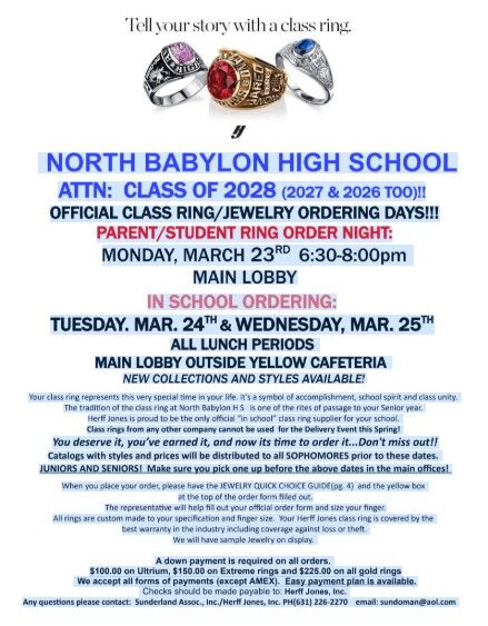 NORTH BABYLON HIGH SCHOOLATTN: CLASS OF 2028 (2027 & 2026 TOO)!!OFFICIAL CLASS RING/JEWELRY ORDERING DAYS!!!PARENT/STUDENT RING ORDER NIGHT:MONDAY, MARCH 23RD 6:30-8:00pmMAIN LOBBYIN SCHOOL ORD...